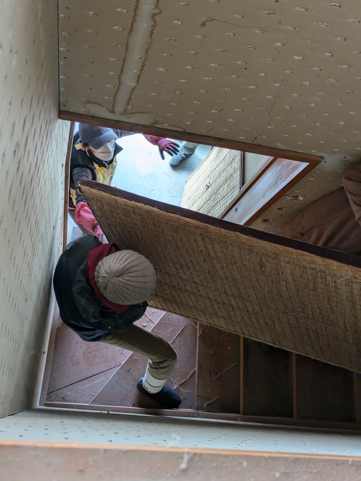 シェルターは2階部分なので、階段をバケツリレー方式でみんなで下ろし、壁をハンマーでバコバコ破壊!
