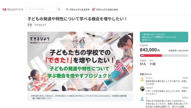 6月9日(月)16:30現在、57名の方から、目標額の46%にあたる合計843,000円のご支援をいただいております!ありがとうございます!!