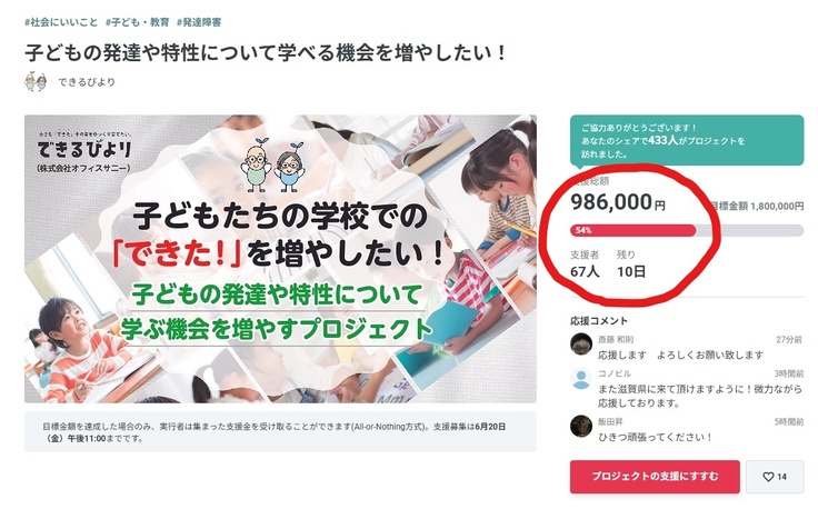 現時点での達成率は54%! 支援金額の合計は986,000円!