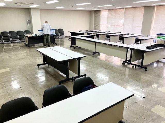 まずは、体験会の会場をセッティング。普通の会議室を、体験会用のレイアウトに変えていきます。