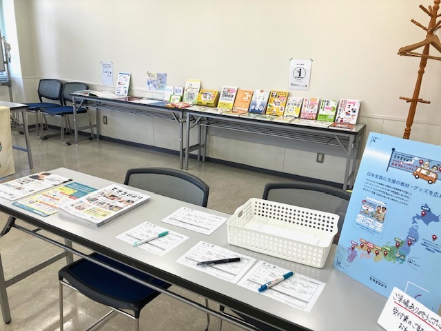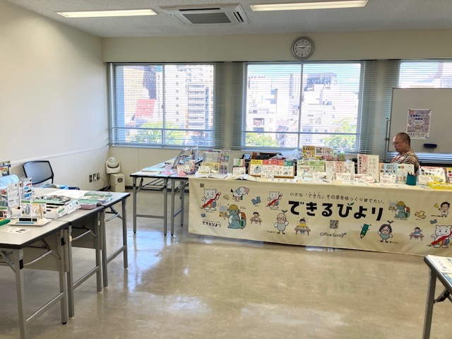 まぁ50回近くも体験会を開催していると、かなり手際も良くなっているようで、2人で約45分でほぼ準備できました!書籍と文具は社長が、できるびよりコーナーと道具は私が担当することが多いです。夫婦ならではの暗黙の担当分けがあります(笑)