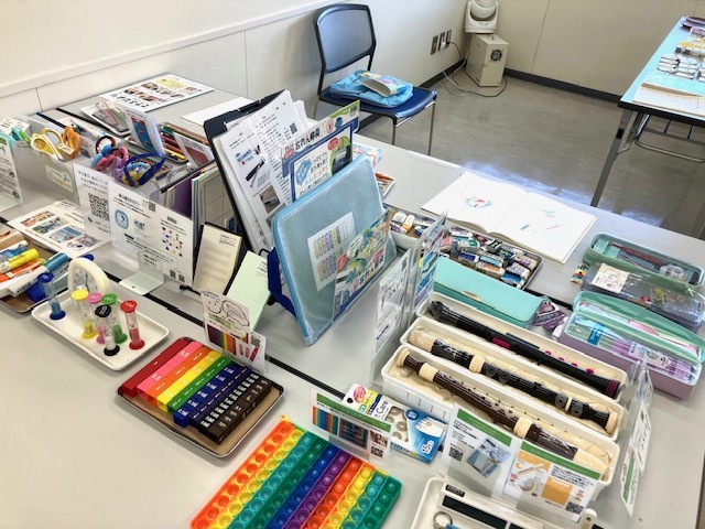 人気の文具・道具コーナー。笛はみんな吹いてみたくなるんだけど、吹けないように透明カバーをしてあります。指の運びだけ確認してみてね。
