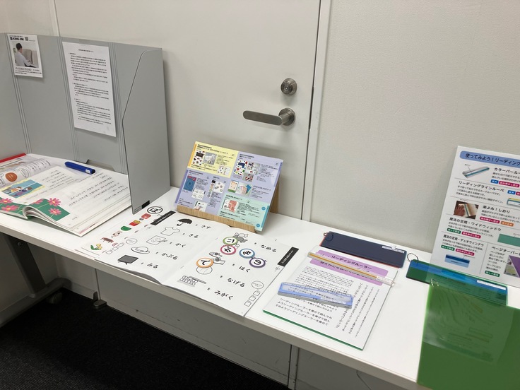 こちらは他社教材や便利グッズコーナー。「読み」が苦手な子のための音声付き教科書はいつも人気です。