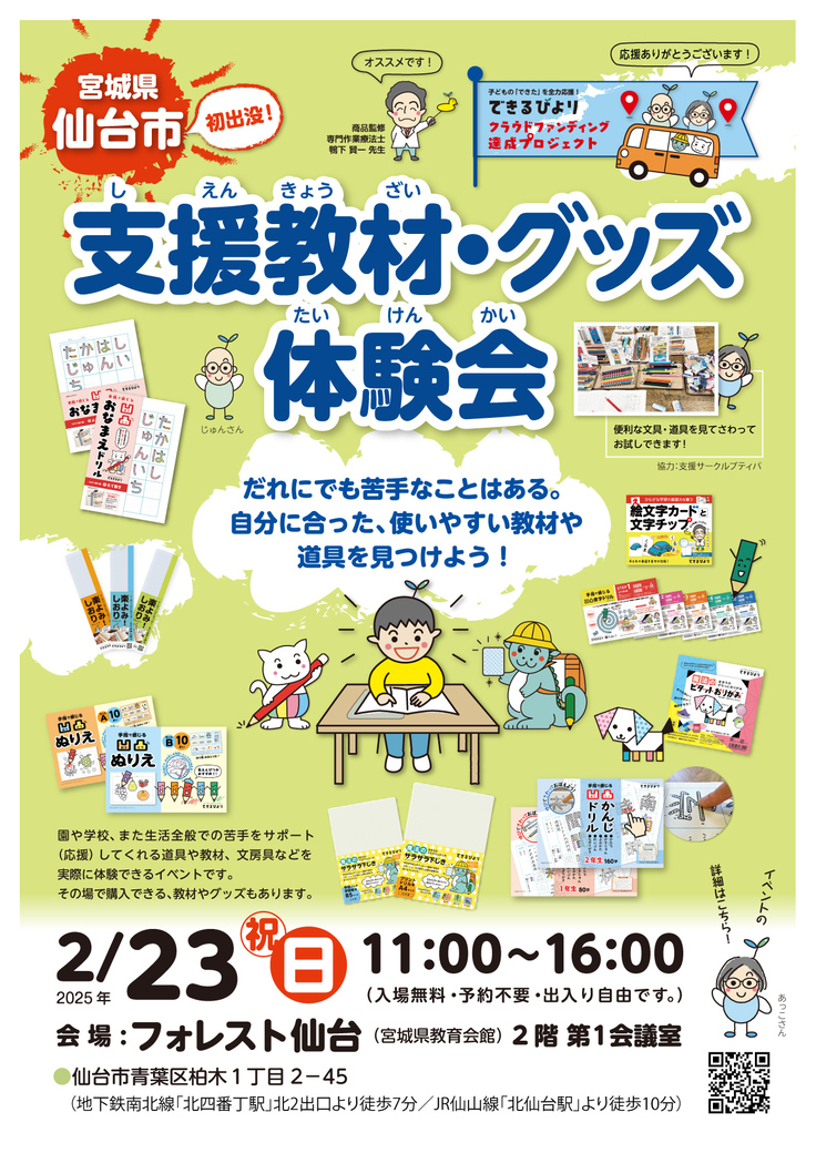 多くの子どもたちが、実際に教材や文具・道具を見て触って体験して、自分がより使いやすいものを見つけてもらうことが目的です。また大人の支援者さんたちも「こんな便利なものがあるのね!」と知っていただき、支援の現場で適切に活用し、子どもたちの「できた!」をアシストする支援につなげていただけたらと思っています。