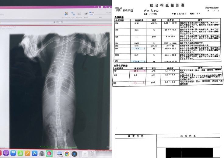 今回デコは胸水があったので、貯水液の検査と血液検査でした。