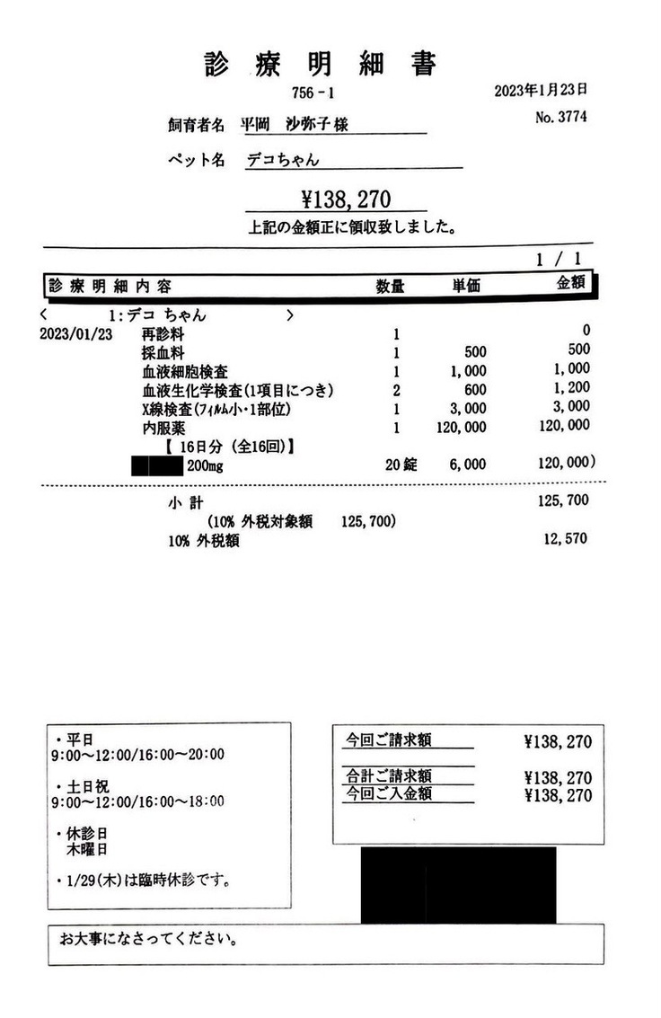 まだ投薬はじめですが、薬を吐くことはなくきちんと接種してくれます。いつ吐いてしまうことを覚えるか、胸水が溜まるか、新しい症状が出るか、ご飯を食べなくなるかなど・・・それらが起きることによって治療費は増えてしまいます。