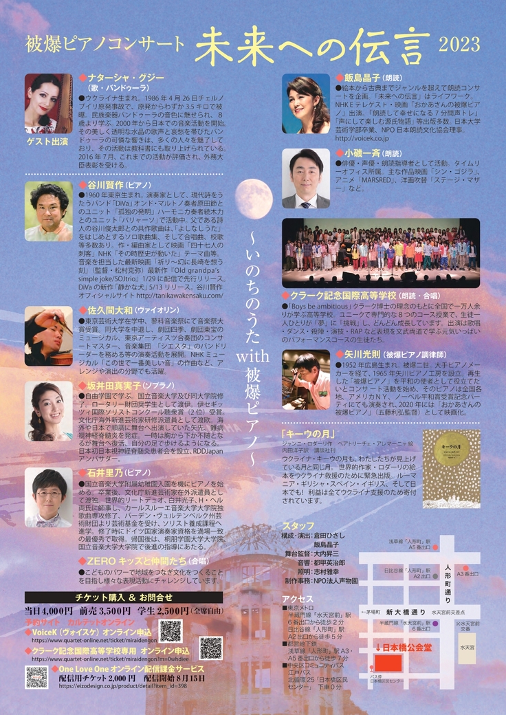 「未来への伝言」のコンサートが、被爆ピアノのこと、またウクライナのことを、皆様と共に学ぶ機会となり、音楽や朗読を通じて平和を考える一助となります事を心から願っております。