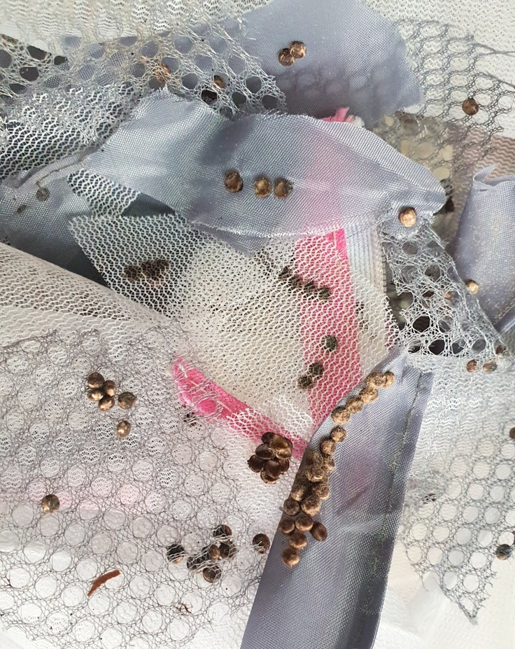今年度はサンプル用に使える繭は、蛹を食い破って成体が出た後のものになってしまいましたが、繁殖用として生まれた約40匹のメスと森で捕獲した100匹以上のメスから写真のように
