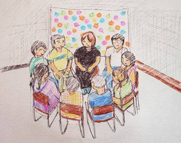 (暗闇体験後はご参加者で対話の時間を)イラスト:森本行雄