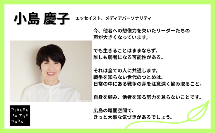 続いて、エッセイストでありメディアパーソナリティでいらっしゃる小島慶子さまより届いたメッセージをご紹介いたします。