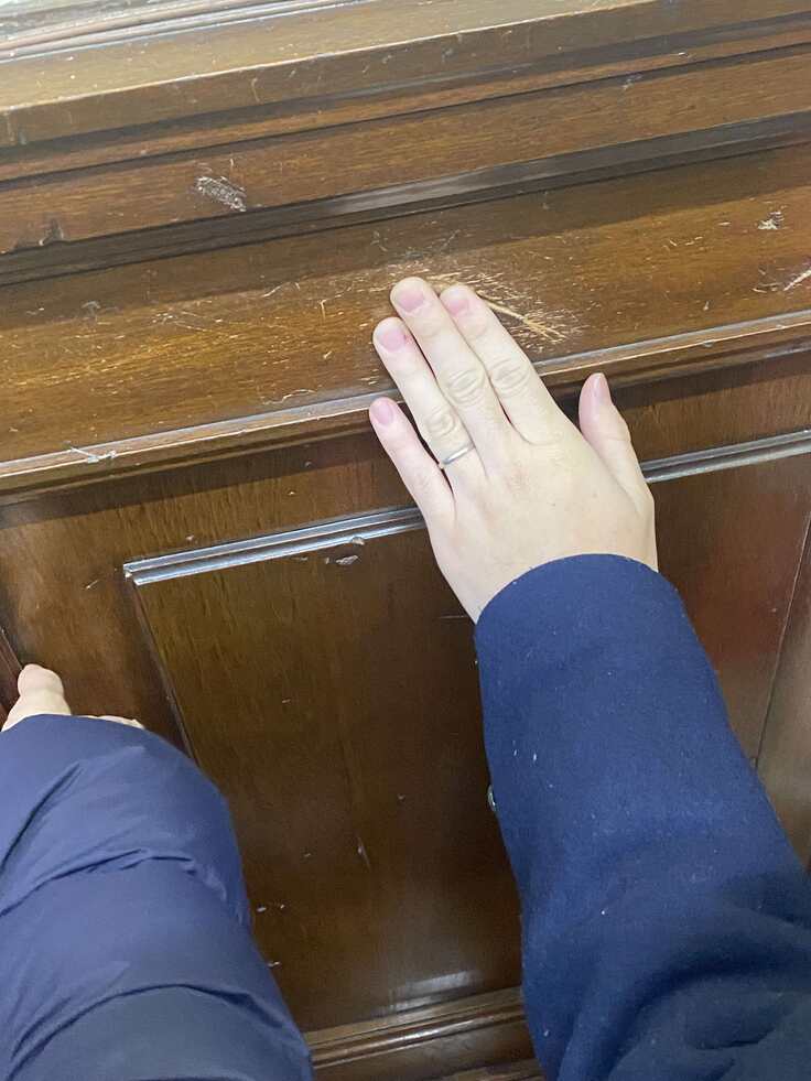 まだ残るガラス片を触って確かめるアテンドたち。