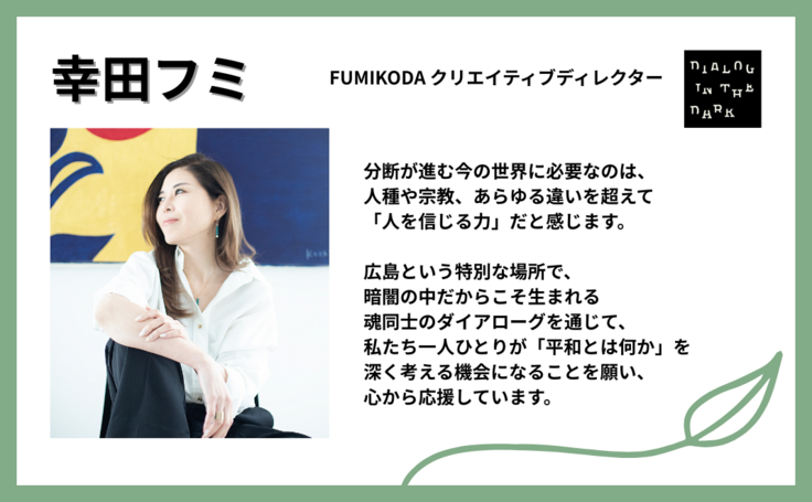 広島という特別な場所で、暗闇の中だからこそ生まれる魂同士のダイアローグを通じて、私たち一人ひとりが「平和とは何か」を深く考える機会になることを願い、心から応援しています。