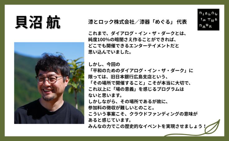 続いて、漆とロック株式会社/漆器「めぐる」代表の貝沼 航様より届いたメッセージをご紹介いたします。