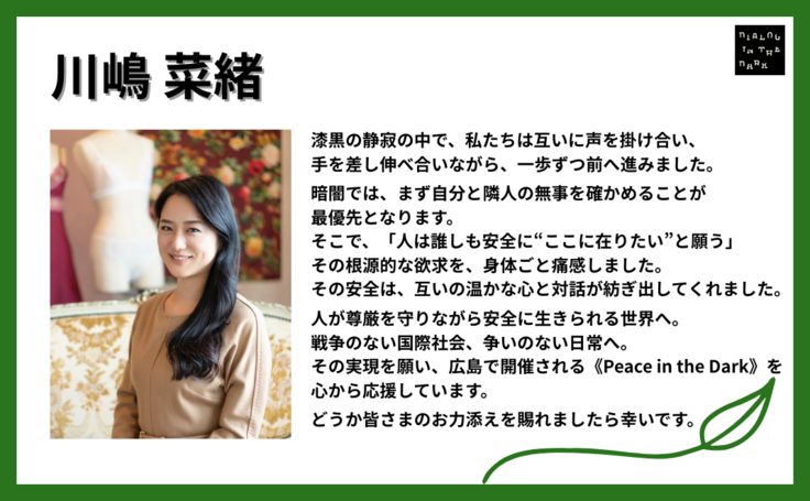 その実現を願い、広島で開催される《Peace in the Dark》を心から応援しています。