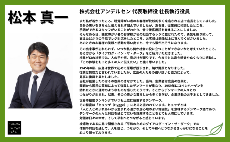 被爆地である広島で開催される「平和のためのダイアログ・イン・ザ・ダーク」での体験や対話を通して、人を信じ、つながり、そして平和へとつながるきっかけになることを心より願っております。