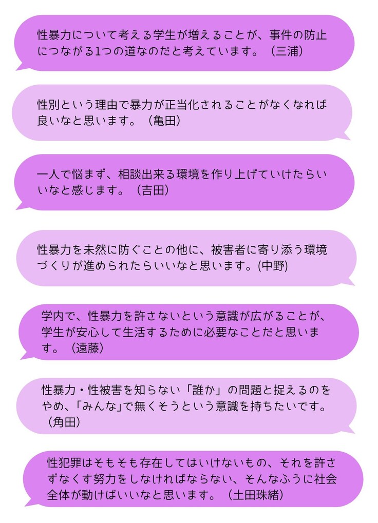 性被害や性暴力は、「自分の身近にはあるはずがない」と思いがちではないでしょうか。学生たちが言うように、まずは「知る」ことが大切だと思います。どのような問題があるか知り、性被害によって傷ついた人の気持ちを想像してみると、「ひとごとではないかも…」「なんとかしなきゃいけないかも…」と思えるかもしれません。あとでご紹介しますが、当室では9月に「知っておきたい!大学における性被害・性暴力の対応方法」と題した研修を開催します。そういった研修や支援団体等の活動、メディアなどをとおして少しずつ、みんなで理解を進めていければと思います。