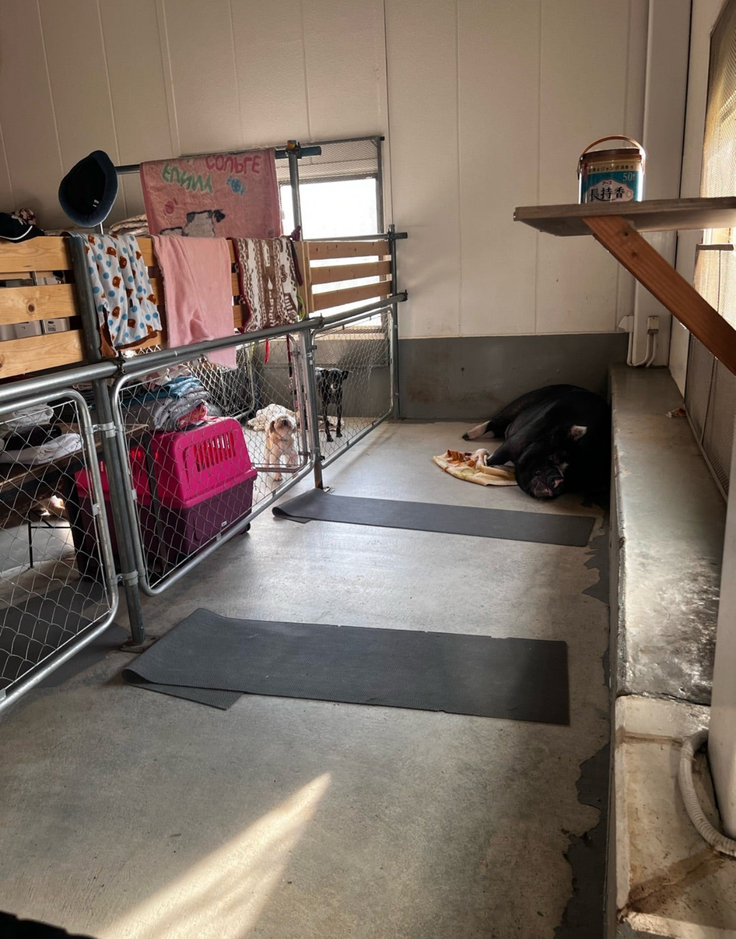 ↑入口入ってすぐの新入り保護っ子と保護豚キャサリンが過ごすスペース
