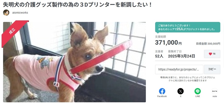 【失明犬の介護グッズ製作の為の3Dプリンターを新調したい!】プロジェクトですが昨日の2025年3月24日(月)23:00に