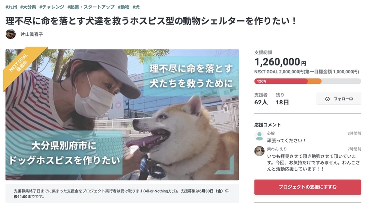 6月5日より始まりました「理不尽に命を落とす犬達を救うホスピス型の動物シェルターを作りたい!」のクラウドファンディングプロジェクトですが、おかげさまで公開から1週間を待たずして目標金額を超えるご支援をいただきました。