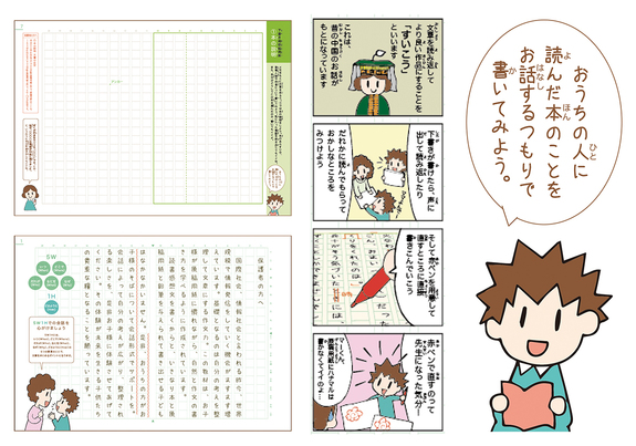原稿用紙では、可愛くカラフルなキャラクターとマンガで、読書感想文の書き方が説明されています。子供が自然と作文の書き方を学び、楽しみながら課題を完成させることで書くことに対する自信を深めることができます。また、安価で教材を提供することによって家庭の教育費負担を減らします。原稿用紙では保護者の方向けの指導法も解説しています。子供の学習意欲向上の効果は、単に学校の成績を良くするだけではありません。親子のコミュニケーションが良くなり、友人同士とのコミュニケーションが良くなり、やがて社会が良くなることに貢献するのが私の理想です。