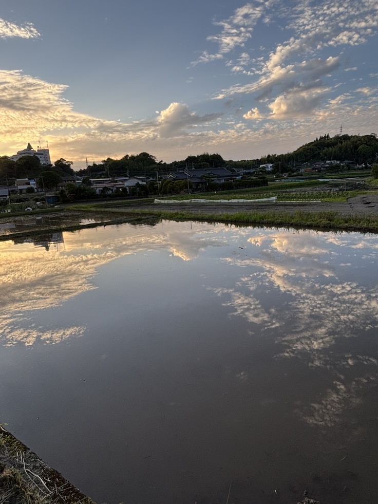 6月上旬、耕うん後水を貼りました。水面に映る夕焼け雲に心奪われる。