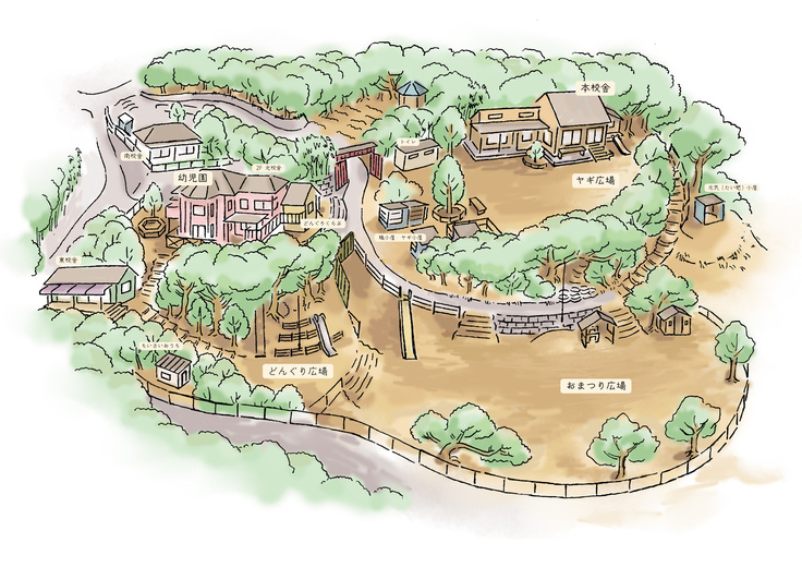イラスト上、広場や建物が分かるように描いていますが、実際には外からみると学校・幼児園全体が、こんもりと森で包まれています。