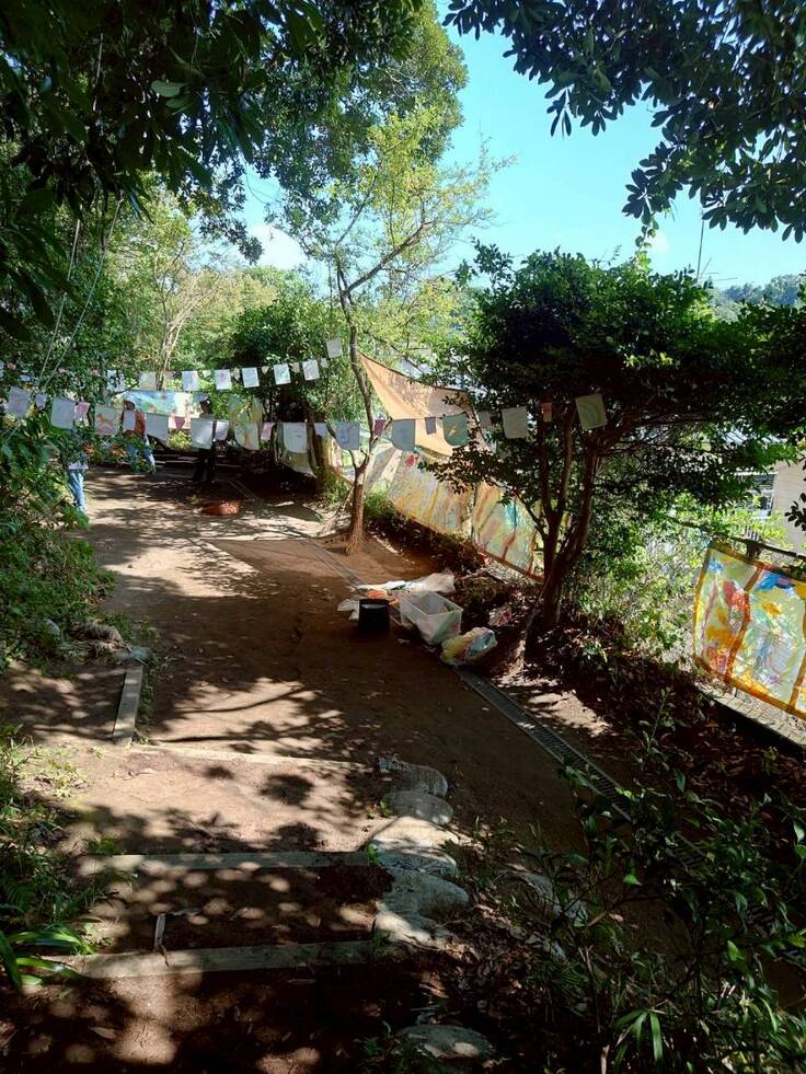 折染めの和紙で作った飾りや、子どもたちの作品が優しく彩ります。