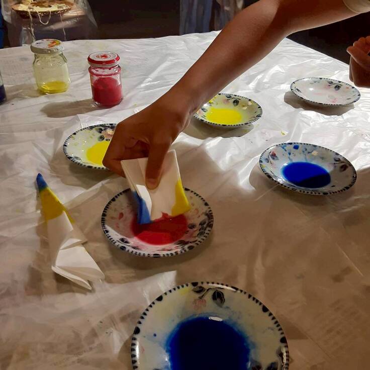 自由に折った和紙を赤色、黄色、青色の絵具に浸していきます。