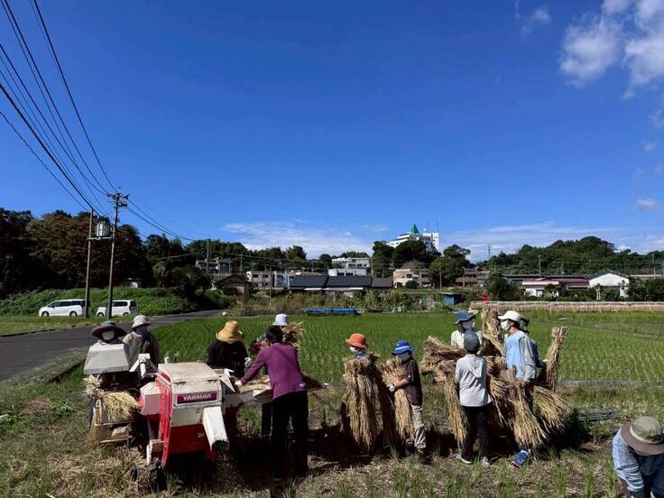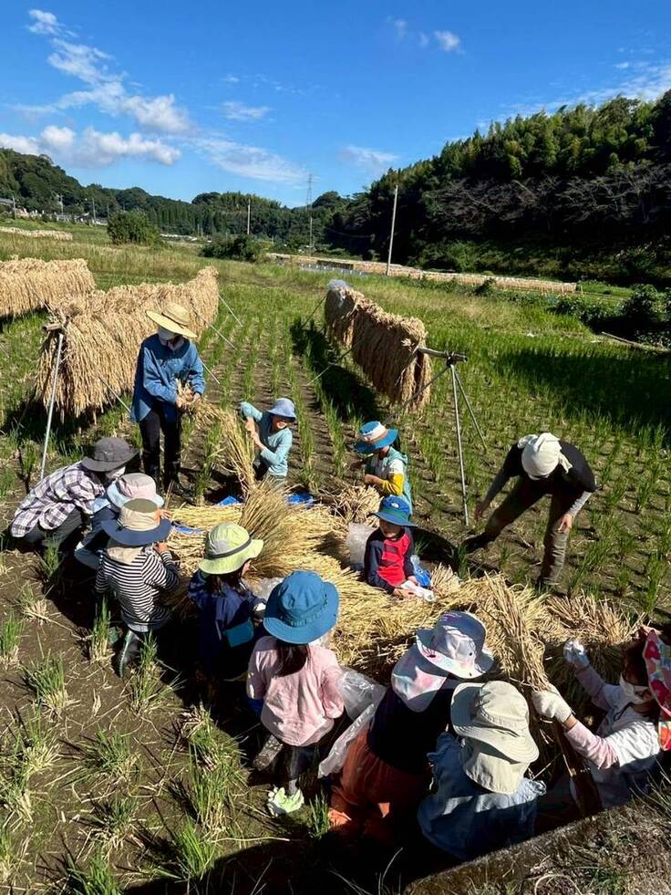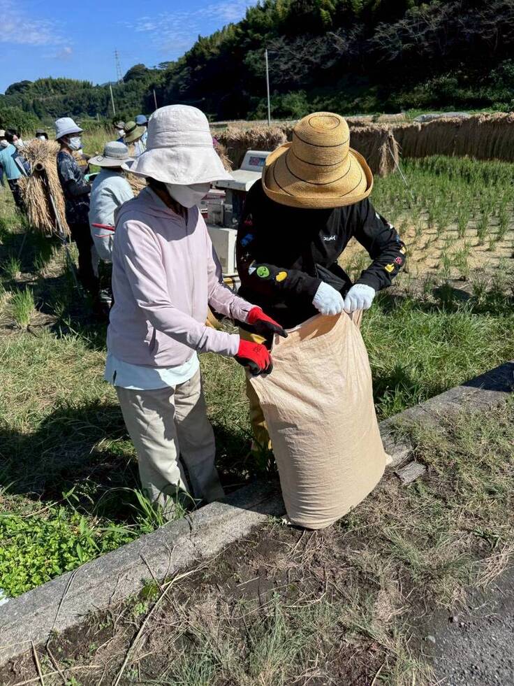 機械の脱穀が終わった稲から、取り残しがないか、みんなで手作業で摘み取ります。