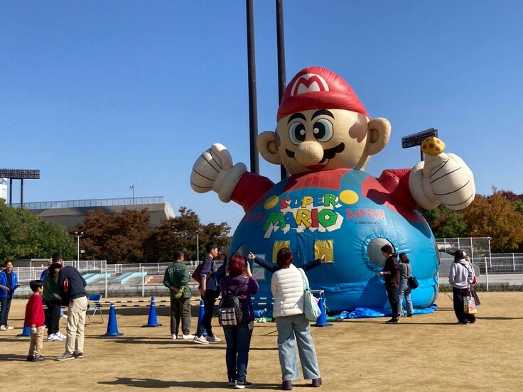 【写真】今年はマリオのエアドーム。木工細工のコーナーやシャボン玉など子どもたちの楽しめるコーナーも工夫しました。