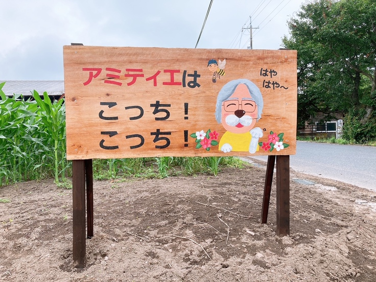 さて、看板は応援メッセージも頂きました田中ファームさんの娘さんが作ってくださったアミティエの手づくり看板です。うちの山根理事長や田中さんにそっくりの絵に仕上がっています。これまでも地域の皆様から、アミティエを応援して頂いております。心から感謝申し上げます。