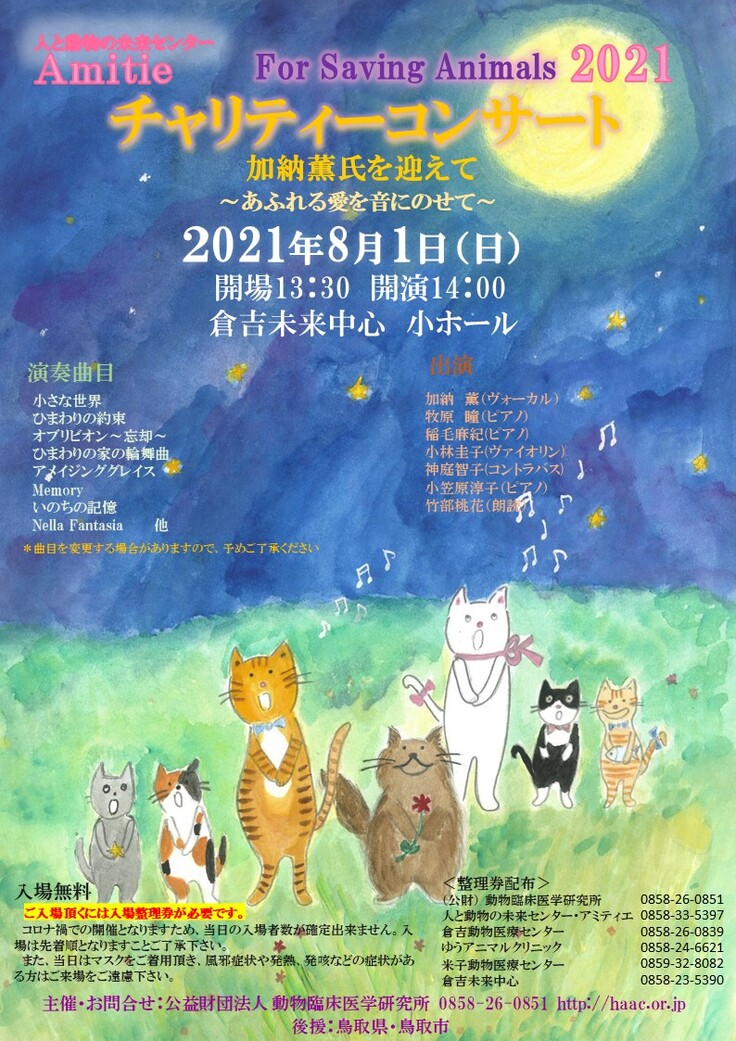 広く一般にアミティエのこと、保護している犬猫たちがいることを知ってもらい、里親さんの希望者を募るために、毎年アミティエチャリティコンサートを開催しています。昨年はコロナ禍のため、開催を中止させて頂きましたが、今年は、元劇団四季の加納さんをお迎えして、8月1日に開催します。