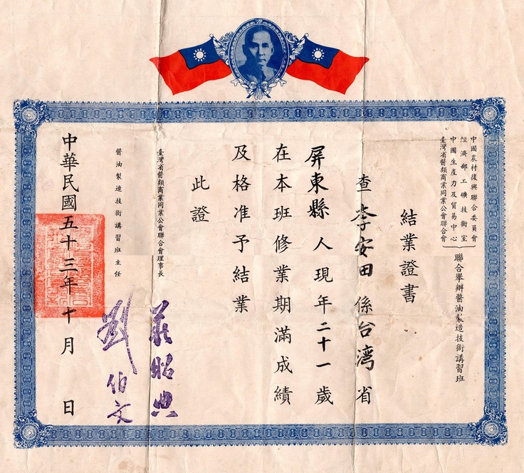 ▲1964年10月に李安田氏は台湾政府機関が行った醤油製造技術講習コースの終了証明書を取得