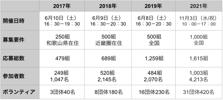 2017年は和歌山県在住の約250組、2018年は近畿圏在住の約520組、2019年は全国から約485組のご家族にご参加いただきましたが、2020年は新型コロナウイルス感染拡大の状況を顧みて、残念ながら開催することはできませんでした。