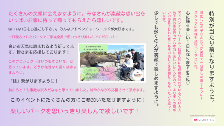 クラウドファンディングや協賛企業様よりご支援いただいておりますが、事業の運営という観点においても物価の高騰等もあり、アドベンチャーワールドのみで祝日に1,000組、4,000名をご招待する貸切イベントの事業費を捻出することが大変難しく、次年に繋げられずにいるのが現状です。