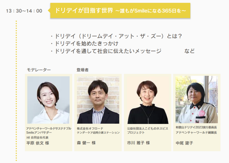なぜ、アドベンチャーワールドでドリームデイ・アット・ザ・ズーを開催するのか、ドリデイが目指す世界とは、「和歌⼭ドリデイ2023実⾏委員会」のメンバーでお届けいたします。