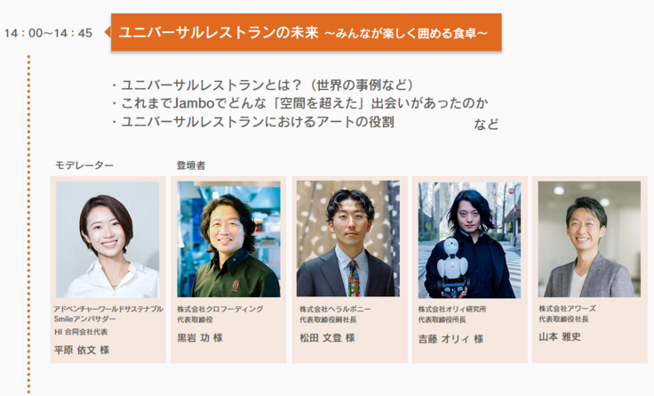 障がいのある社員や障がい者就労訓練者が活躍するユニバーサルレストランを運営するル・クログループ 株式会社クロフィーディングの代表 黒岩 様や、アドベンチャーワールド内のレストラン「Jambo」でも活躍している、分身ロボット「OriHime」を製作する株式会社オリィ研究所代表取締役の吉藤 様をお迎えし、「ユニバーサルレストランの未来」をテーマにお届けいたします。