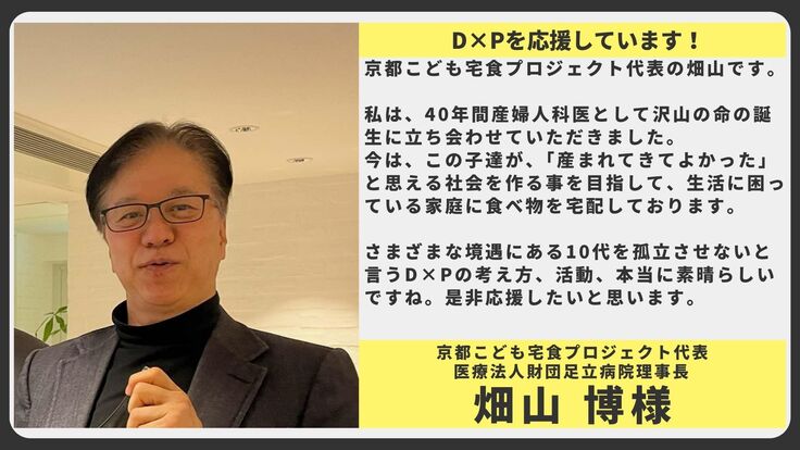 さまざまな境遇にある10代を孤立させないと言うD×Pの考え方、活動、本当に素晴らしいですね。是非応援したいと思います。
