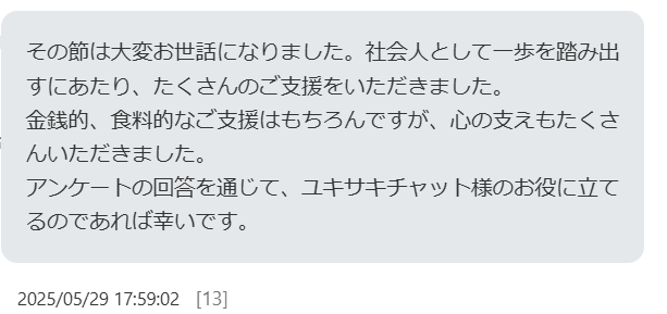 実際にサポートを受け取った若者からは以下のようなメッセージが届きました。