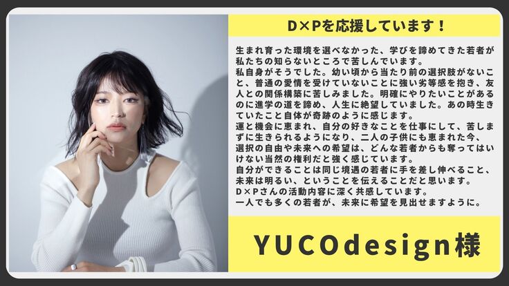 D×Pさんの活動内容に深く共感しています。一人でも多くの若者が、未来に希望を見出せますように。
