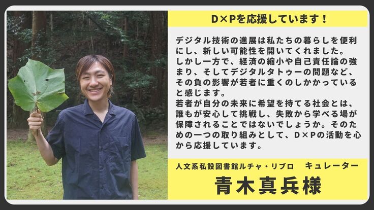 デジタル技術の進展は私たちの暮らしを便利にし、新しい可能性を開いてくれました。しかし一方で、経済の縮小や自己責任論の強まり、そしてデジタルタトゥーの問題など、その負の影響が若者に重くのしかかっていると感じます。若者が自分の未来に希望を持てる社会とは、誰もが安心して挑戦し、失敗から学べる場が保障されることではないでしょうか。そのための一つの取り組みとして、D×Pの活動を心から応援しています。
