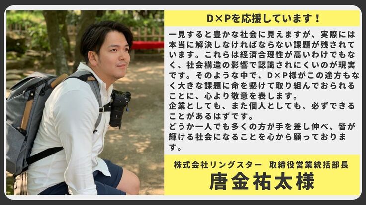 そのような中で、D×P様がこの途方もなく大きな課題に命を懸けて取り組んでおられることに、心より敬意を表します。