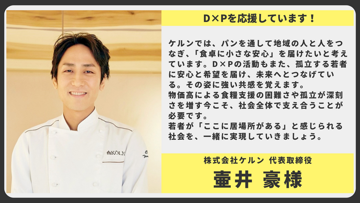 ケルンでは、パンを通して地域の人と人をつなぎ、「食卓に小さな安心」を届けたいと考えています。D×Pの活動もまた、孤立する若者に安心と希望を届け、未来へとつなげている。その姿に強い共感を覚えます。