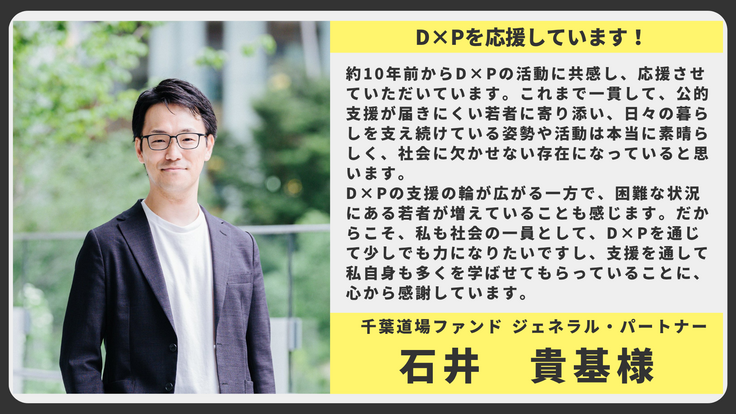 約10年前からD×Pの活動に共感し、応援させていただいています。これまで一貫して、公的支援が届きにくい若者に寄り添い、日々の暮らしを支え続けている姿勢や活動は本当に素晴らしく、社会に欠かせない存在になっていると思います。