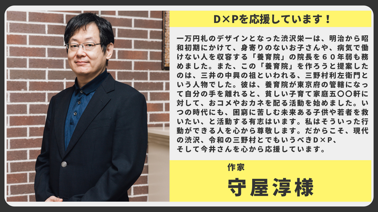 一万円札のデザインとなった渋沢栄一は、明治から昭和初期にかけて、身寄りのないお子さんや、病気で働けない人を収容する「養育院」の院長を60年弱も務めました。また、この「養育院」を作ろうと提案したのは、三井の中興の祖といわれる、三野村利左衛門という人物でした。彼は、養育院が東京府の管轄になって自分の手を離れると、貧しい子育て家庭五〇〇軒に対して、おコメやおカネを配る活動を始めました。いつの時代にも、困窮に苦しむ未来ある子供や若者を救いたい、と活動する有志はいます。私はそういった行動ができる人を心から尊敬します。だからこそ、現代の渋沢、令和の三野村とでもいうべきD×P、そして今井さんを心から応援しています。