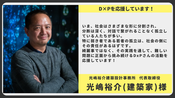いま、社会はさまざまな形に分割され、分断は深く、対話で繋がれることなく孤立している人たちが多い。特に弱き者である若者の孤立は、社会の側にその責任があるはずです。綺麗事ではなく、その実践を通して、難しい問題に正面から挑み続けるDxPさんの活動を応援しています!