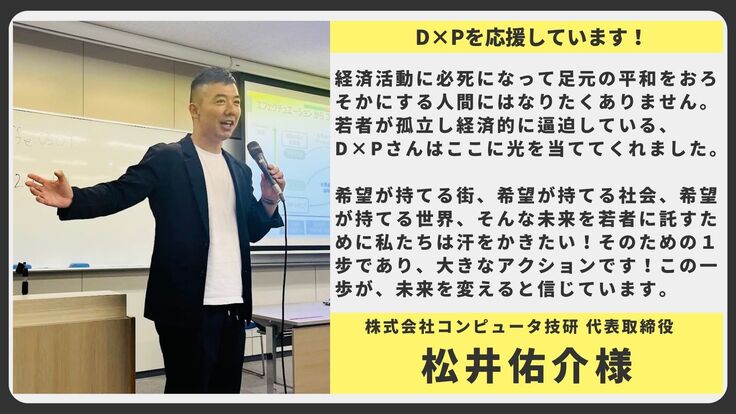 経済活動に必死になって足元の平和をおろそかにする人間にはなりたくありません。若者が孤立し経済的に逼迫している、D×Pさんはここに光を当ててくれました。希望が持てる街、希望が持てる社会、希望が持てる世界、そんな未来を若者に託すために私たちは汗をかきたい!そのための1步であり、大きなアクションです!この一歩が、未来を変えると信じています。