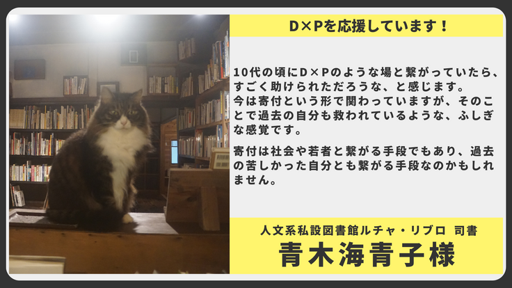 10代の頃にD×Pのような場と繋がっていたら、すごく助けられただろうな、と感じます。今は寄付という形で関わっていますが、そのことで過去の自分も救われているような、ふしぎな感覚です。寄付は社会や若者と繋がる手段でもあり、過去の苦しかった自分とも繋がる手段なのかもしれません。