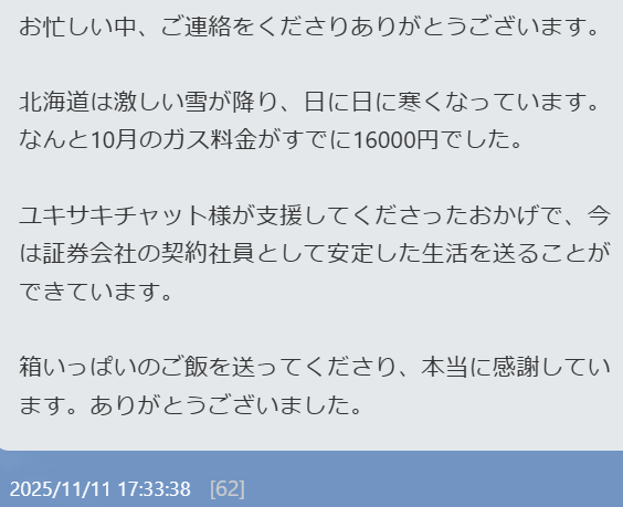 先日、ユキサキチャットを利用した若者からメッセージが届きました。