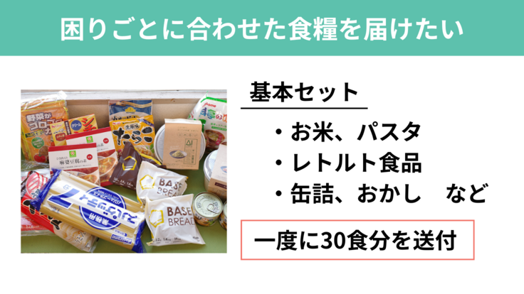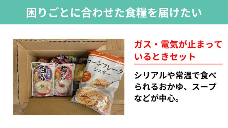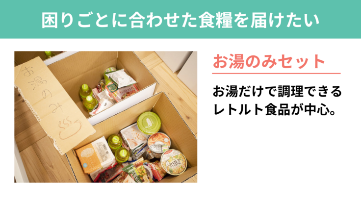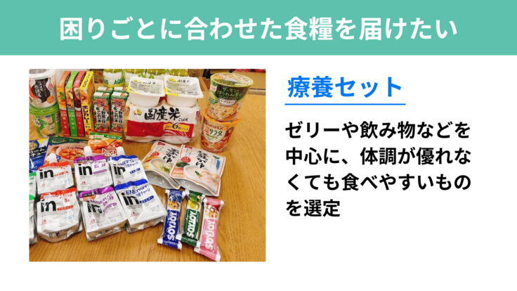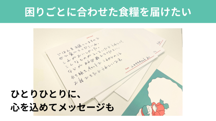 体調を崩している方には胃腸に優しいものを、電気やガスを止められてしまっている方にはガスコンロなどで温められるものを届けます。若者の健康を守ることはもちろんですが、ひとりひとりに合わせた食べ物を届けることで、自分のことを考えてくれる誰かがいる、自分の思いや言葉を受け取ってくれる誰かがいるということを実感してもらいたいと考えています。
